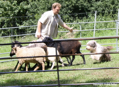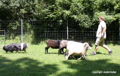 Das Interesse an den Schafen ist so groß, dass sie auch mit André arbeitet. Sie lässt sich sehr schön von ihm blocken und arbeitet mit großer Ausdauer und gutem Durchsetzungsvermögen. Auf dem Bild sieht man, wie sie in typischer Beardieart, nämlich auf die Vorderbeine springend, die Schafe antreibt.